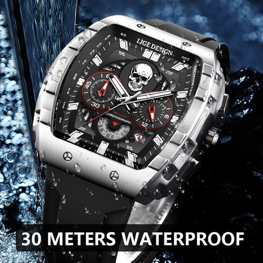 LIGE Skeleton Skull Dial Sport Army Watches Mens Fashion Luxury Waterproof Quartz Watch Chronograph Montre Homme